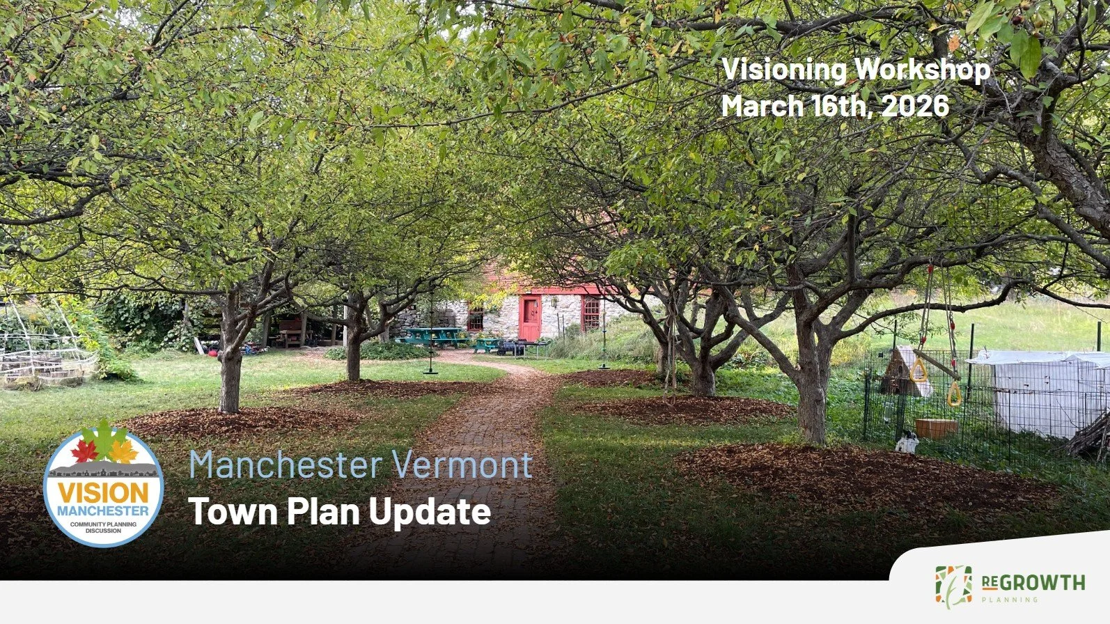 The Town Plan update is being overseen by the Town of Manchester Planning Commission, with the help and support of our planning consultants, Regrowth Planning and Saratoga Associates. This work is funded through a Municipal Planning Grant awarded to the town by the Vermont Agency of Commerce and Community Development.